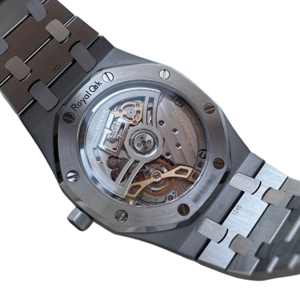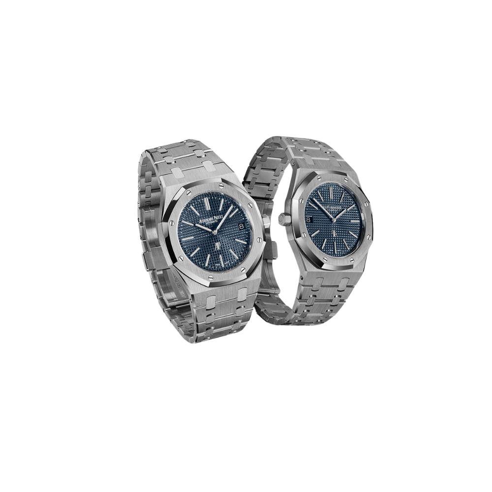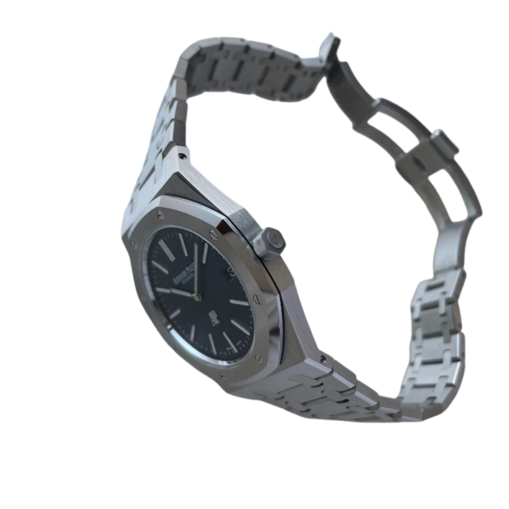 The Audemars Piguet Royal Oak “JUMBO” EXTRA-THIN “50TH ANNIVERSARY” Ref# 16202ST.OO.1240ST.01 features the high-end sporty style characteristic of Audemars Piguet, blending luxury touches with a classic design. It stands out with the classic octagonal bezel made of 904L stainless steel and a refined blue-grey dial featuring the Tapisserie pattern. With a slim profile of just 8.5mm creating an elegant feel, this model is modern and easy to wear daily while preserving the iconic quality of the Royal Oak line, suitable for those who love minimalism and class.